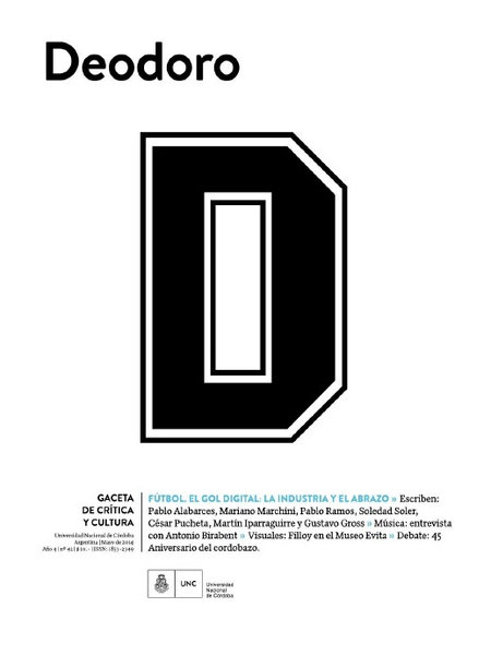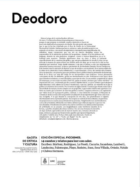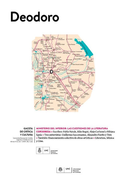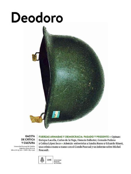 Deodoro se publicó en la ciudad de Córdoba, entre 2010 y 2016. No se propuso ser una revista académica, ni de actualidad. Tampoco nostálgica ni pasatista ni solemne. No quería tampoco ser una revista de información (aunque en sus páginas se hayan sentado posiciones e intervenciones en torno a temas de inmediato interés público). Sí era, o buscaba ser, una revista atenta, de lectura exigente, que no se demoraba en lo que ya se sabe o se espera leer, sino en lo desconocido o lo que estaba olvidado o lo que permanecía secreto. Quizá una revista de inactualidad. Lo que no significaba desentenderse de lo que sucedía en torno, en la ciudad de la que era un objeto cultural más.